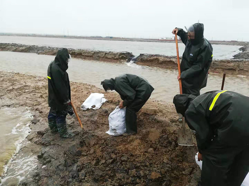 各生產單元及有關職能部門組織帶領1000多名職工自9日至12日,連續四個晝夜嚴密監控,嚴防死守。其間,防汛辦公室按照渤海新區防汛部門指示和滄鹽集團防汛指揮部要求,多次組織召開防汛專題會議并安排部署防汛措施,關鍵時刻調用6臺挖掘機筑埝增高36處共計1865米,搶險疏通堵卡攔壩24處,同時采取了拉閘停電禁止外排淡水的超常措施。暴風雨中為提高泄洪排放量,通過現場冒雨勘查,制定了通過軍鹽路景觀河、中疏港路上另辟排淡渠道的決策,現場新開挖四處排淡應急溝道工程,為緩解排淡壓力,避免淡水漫灘贏得了寶貴時間,更為新區、園區化工企業財產安全奠定了技術保障。在搶險抗災的緊要關頭,長蘆鹽業公司組織一線突擊隊員在風雨中砸樁、扛袋、護埝,嚴防死守,晝夜奮戰在抗災一線,以堅強的意志,不屈的精神,譜寫了又一曲抗災保產的壯歌。各部(處)室、子公司也按照滄鹽集團防汛指揮部的統一部署,緊緊圍繞防汛大局,全力做好保障工作。