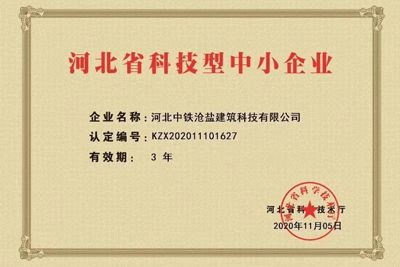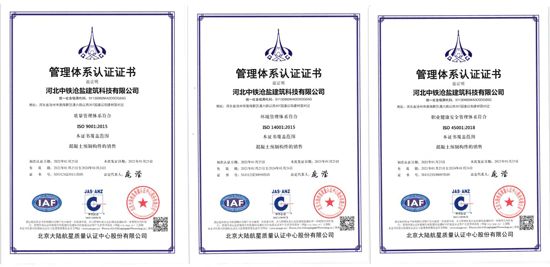 自去年投產以來,中鐵滄鹽科技創新喜報不斷,捷報頻傳,先后取得11項實用新型專利、3項發明專利、7項3A信用評價證書。繼2020年11月獲得河北省科學技術廳評選的河北省創新型中小企業的稱號后,通過積極的管理謀劃布局,2021年1月取得質量體系、環境管理體系、職業健康三大體系ISO9001認證;2021年8月通過了全國高新技術企業認定管理工作領導小組評選,獲批河北省2021年第一批高新技術企業認證。2021年9月,公司按照河北省工信廳被動式超低能耗建筑產業項目的文件要求,深度研究政策要求、全面匯總編寫課題資料,通過了工信廳第三方專家技術評審和外部財務審計等工作,被順利列入河北省工信廳被動式超低能耗建筑產業項目合格名單,納入政府資金滾動支持項目庫。