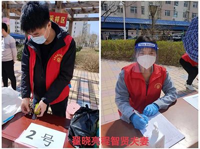 居家辦公的共產(chǎn)黨員陳玲、李國剛夫婦,主動申請加入鹽場新區(qū)志愿服務(wù)隊,兩人相互鼓勵,并肩作戰(zhàn),積極配合醫(yī)務(wù)人員、社區(qū)工作人員做好信息核實登記、現(xiàn)場布置、發(fā)動喊人、維持秩序、場地消毒、深夜照明等項工作,并主動提供桌椅板凳以供檢測使用。