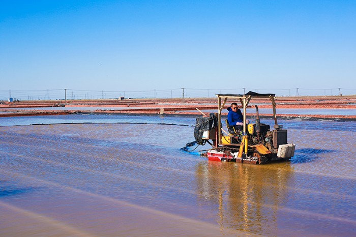 春扒現(xiàn)場,座座銀山悄然聳立。職工們駕駛扒鹽機(jī)穿梭在結(jié)晶池中,制鹵工充分利用天氣,多趕鹵趕好鹵,電管站和維修工隨時待命,現(xiàn)場一片繁忙景象。