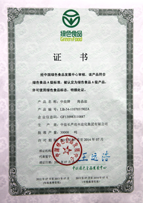 為申請綠色食品認證,公司從去年開始,投資2000多萬元對食鹽生產工藝和設備進行了技術改造,并努力加強食鹽生產各環節的管理,按照天然、營養、優質的特定方式組織食鹽生產,順利通過了綠色食品鑒定機構的環境評價、產品檢測,最終取得了中國綠色食品發展中心的認證,于7月份領取了綠色食品證書。