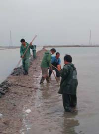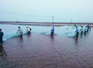 面對形勢異常嚴峻的雨情,公司保原鹽、保塑苫、保灘田的搶險戰役打響了,從7月17日的141.2毫米暴雨開始,防汛副總指揮李蜻海就防汛工作進行了安排:生產部負責好全公司防汛工作的統一調度工作,制鹵場要想盡一切辦法確保主排淡系統的疏通,并要求各制鹽場的防汛指揮機構組織全部啟動,全體一線干部職工都要隨時待命,嚴陣以待,嚴防死守,做好搶險自救工作。與此同時,防汛副總指揮李蜻海帶領生產部、制鹵場有關人員對主排淡系統進行了詳細巡查,并積極協調相關部門對影響排淡的17處堵卡地段進行了徹底的加寬疏通清理。隨著7月21日60.2毫米降水的到來, 29日、30日,8月2日、3日連續四場計270毫米的強降水席卷了整個生產場區,生產基礎遭受到空前的劫難,隨著化工企業、海通物流、周邊村莊荒水以及縣辦及周邊鹽場排淡水的大量涌入公司主排淡溝道,使排淡溝道水位迅猛上漲,外圍水位已經高于灘內水位,灘內淡水無法外排,情況萬分緊急,公司防汛形勢處于一級警戒狀態。