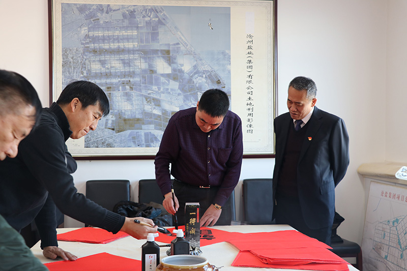 2月2日,黃驊市文廣新局組織本市6位知名書畫家到公司開展“送春聯·進滄鹽”活動。在活動現場,書畫家們潑墨揮毫、妙筆生花,不僅書寫了100余幅象征幸福團圓的福字和春聯,而且深情地描畫出象征富貴吉祥的“牡丹圖”等繪畫作品,營造出喜慶祥和的節日氛圍。